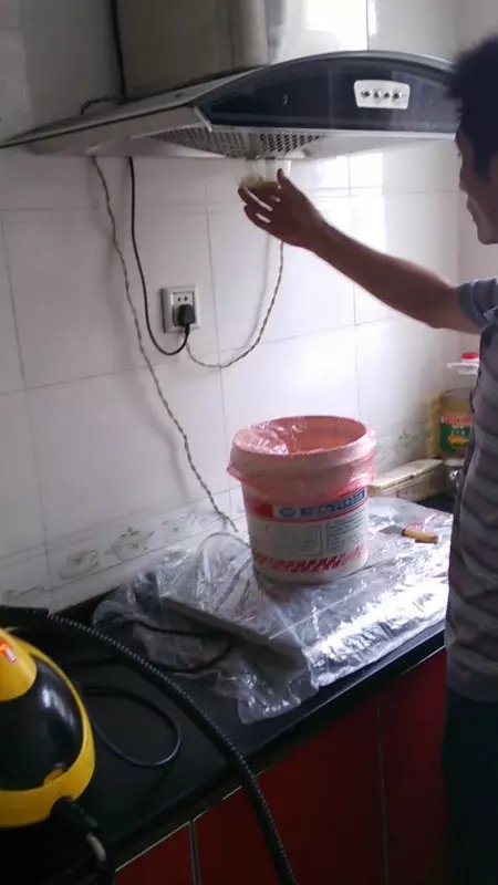 2、啟動抽油煙機(jī),用盛滿清潔*的塑料瓶朝待洗部位噴射清洗液,此時可見油污及臟水一道流入儲油斗中,隨滿隨倒。