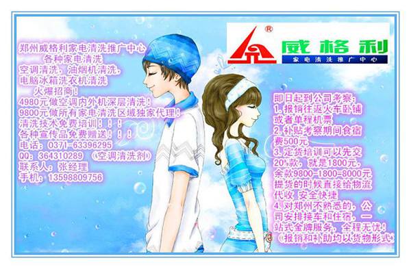 如果你想創(chuàng)業(yè),又找不到投資方向,請聯(lián)系我們。如果你在做家電制冷維修,那么家電清洗無疑使你多了一項增值項目。如果你做著家政保潔,那么在不增加人力的情況下加一項清洗項目,多一份收益,何樂而不為呢。如果你是在銷售家用電器,還要為售后服務(wù)不完善發(fā)愁嗎,家電清洗服務(wù)是不錯的選擇。