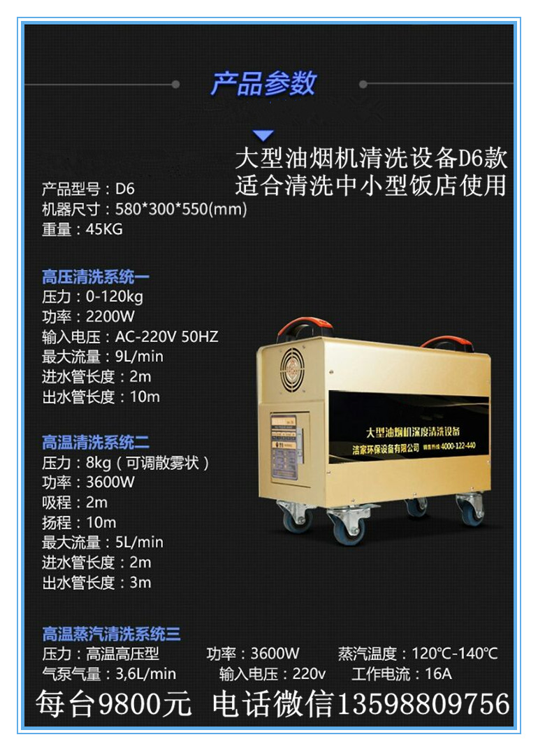 大型油煙機(jī)清洗機(jī)D6款適合各種中小型飯店清洗使用。