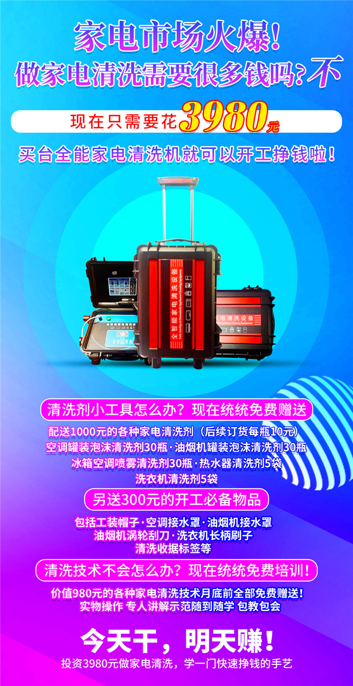 很簡單:1.沒加盟費。家電清洗*能機一體機+多功能管道清洗機+280瓶家電清洗劑,只要9800元就算加盟。