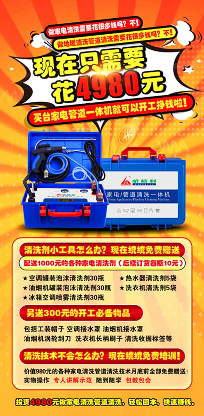 投資4980元做家電清洗管道清洗,輕松回本,快速賺錢(qián)。