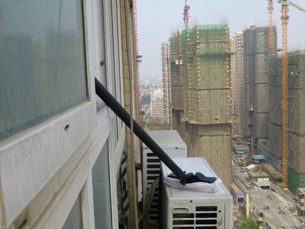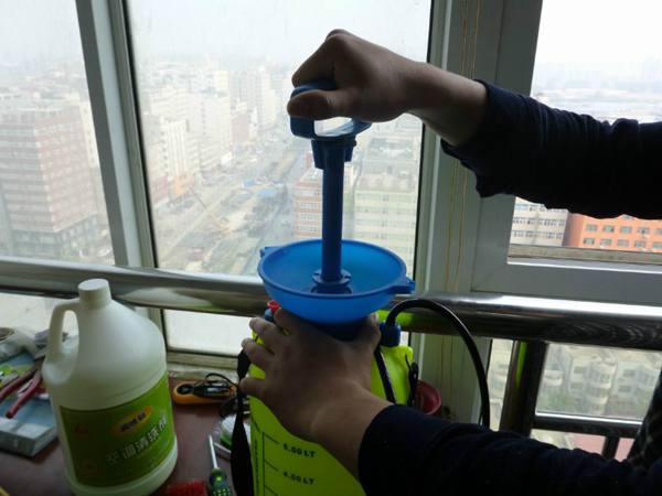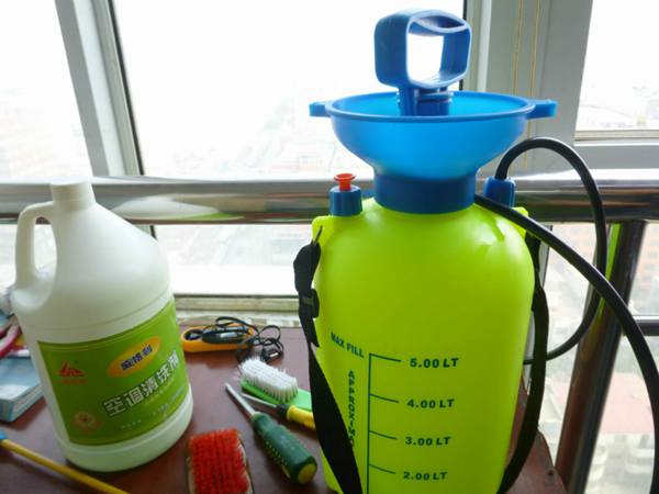 我們知道,空調(diào)室外機一般安裝位置距窗外不遠(yuǎn),在清洗的時候需要用一個類似打農(nóng)藥用的噴霧器,里面裝上清洗劑,然后手動加壓,直接噴撒即可。一般的噴霧器加上噴霧桿,長度都在2米以上,因此人站在室內(nèi)就可以直接進行室外機清洗.這和高度沒有關(guān)系,操作人員根本無須高空作業(yè).清洗起來也很容易。我們配送的清洗工具里面有專業(yè)針對外機清洗的。