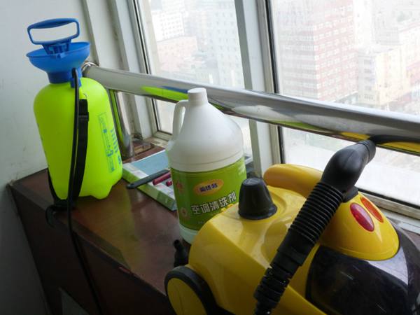 如圖所示,為清洗所用到的工具和產(chǎn)品,就是洗多多的桶裝濃縮清洗劑和噴霧器,選配工具就是輪式1500瓦大功*蒸汽清洗機。操作時間,根據(jù)空調(diào)的臟污程度和自己的熟練程度,一般大約在10-15分鐘。