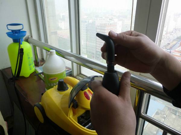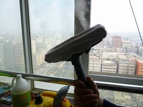 圖4,把1500瓦的一次加水量1500ml的大蒸汽清洗機加水燒開,槍頭處加上一個可以轉(zhuǎn)向的小噴頭,就可以噴灑到空調(diào)看不到的那個側(cè)面和背面。(大蒸汽清洗機的各種小配件都是前面的那個蓋子下面)。